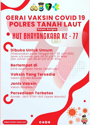 “Akselerasi vaksinasi di Kabupaten Tanah Laut terus di gencarkan bertepatan kami menyambut HUT Bhayangkara ke 77, gerai Vaksin ini di buka untuk umum dengan waktu yang telah di tentukan dan diprioritaskan untuk vaksin 1,2 dan Booster” kata Kapolres.